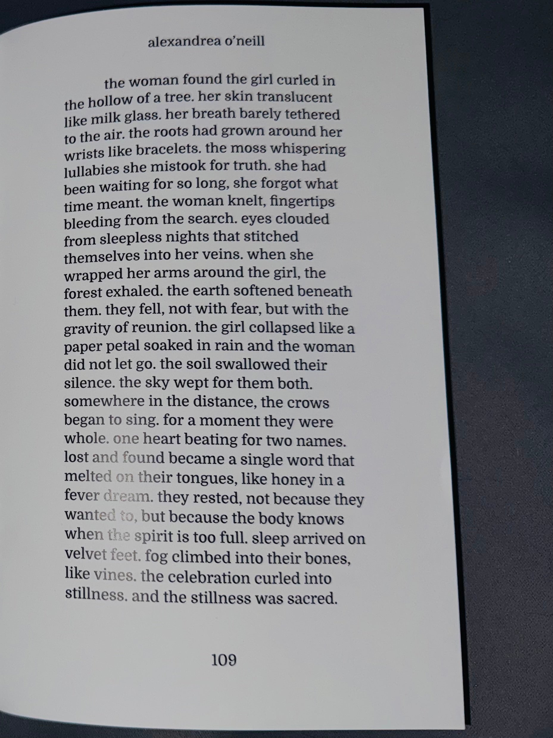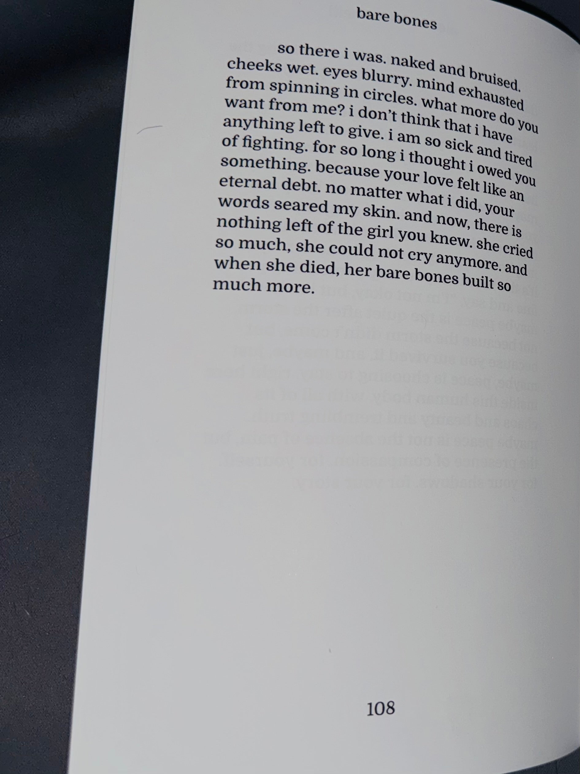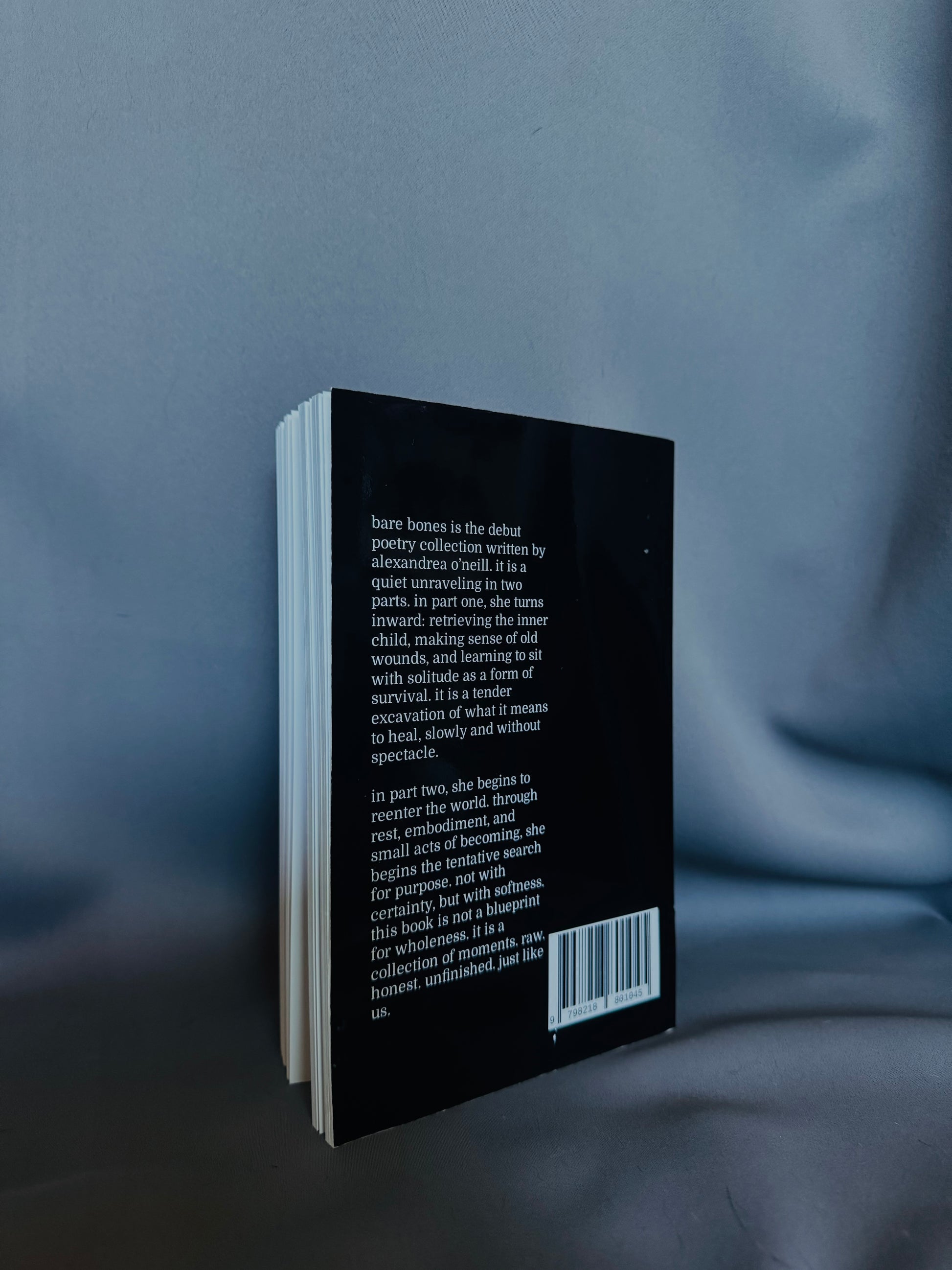 bare bones is the debut poetry collection by alexandrea o'neill. it is a quiet unraveling in two parts. in part one, she turns inward: retrieving the inner child, making sense of old wounds, and learning to sit with solitude as a form of survival. it is a tender excavation of what it means to heal, slowly and without spectacle. in part two, she begins to reenter the world. through rest, embodiment, and small acts of becoming, she begins the tentative search for purpose. not with certainty, but with softness. this book is not a blueprint for wholeness. it is a collection of moments. raw. honest. unfinished. just like us.